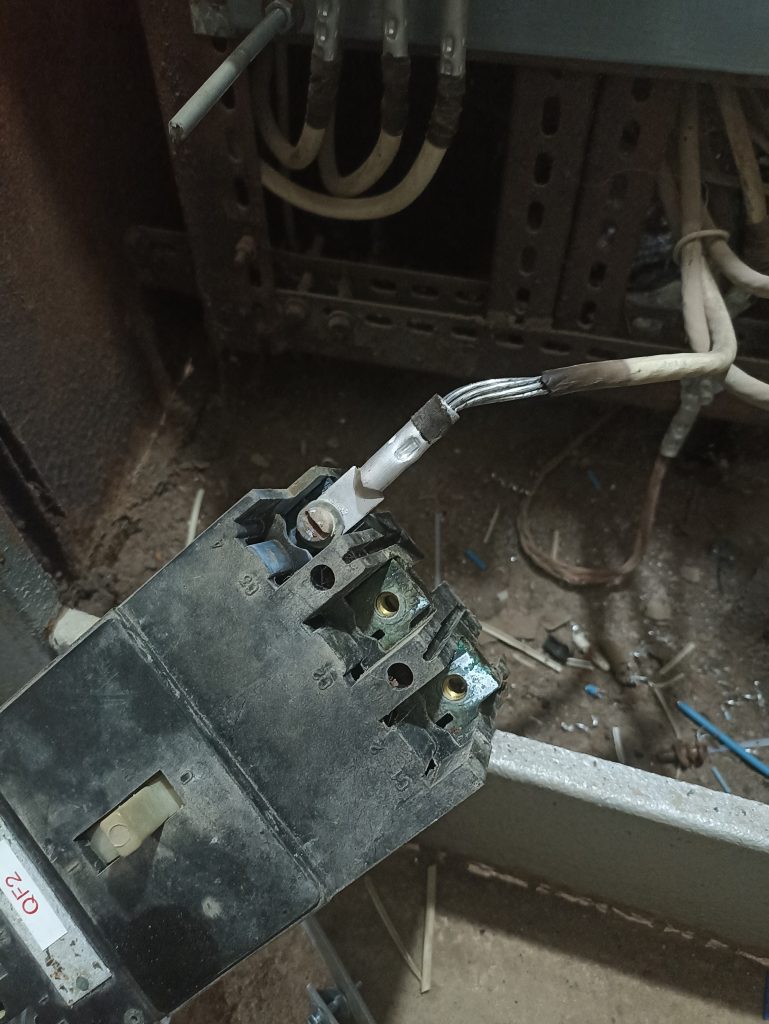 Даже не откручивается падла, ладно, есть бокорезы-откусываем…Теперь Добби свободен.дальше облегченно примеряем новый автомат, на заранее подготовленную панель, оставляем зазор в пару мм между автоматами, для охлаждения и чтобы они друг друга не подогревали. Закрепляем, подгибаем шинки, надеваем термоусадку, Засаживаем в наконечники кабеля, опресовываем, и видим конечный результат, немного конченный конечно , но всёже конечный.